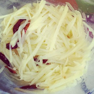 锅内下油 油热加入蒜起个味 加入土豆丝 翻炒一会加入白醋和辣椒 最后加盐调味就可以出锅啦