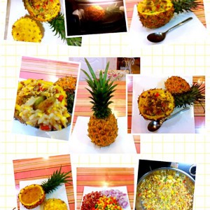 将饭盛入菠萝加盖后放入光波锅180度烘烤3分钟,也可放入蒸笼上汽后蒸5分钟,使菠萝本身水果香味与米饭充分融合