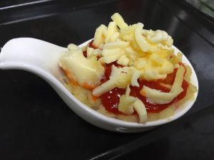 放入容器中,撒上番茄酱,最后撒上马苏里拉芝士