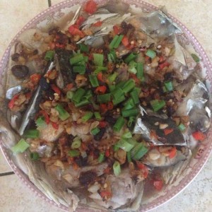 爆好后的材料铺在鱼头上,开锅蒸十五分钟