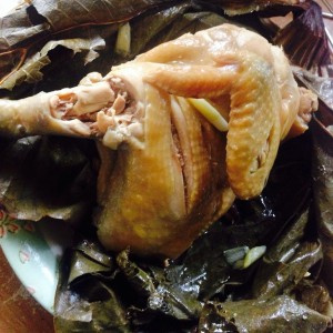 最后切葱,香菇,塞在鸡里面,因为我是2个人吃所以只用了半只鸡。滴几滴香油,用荷叶包起来