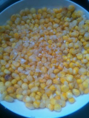 倒入与玉米粒持平的色拉油。转中火煎五六分钟。不要用铲子铲玉米,可以不停地转动锅。