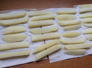 土豆切条,粗细看个人喜好。反复冲洗,再用清水泡20分钟,尽可能去除淀粉。烧水,等水开下入薯条,放盐。煮三分钟,七成熟(不然太熟就会太软,下面步骤不好操作,也不好吃)捞出薯条,晾干,一定要干。否则放入冰箱就会结冰渣。