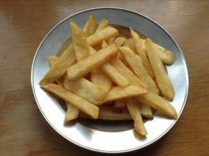 薯条放入冰箱冷冻(主要是方便以后想吃了直接拿出来炸)也可以不冻直接炸。下油,大火炸一会儿,颜色变成淡黄色捞出,等一会儿再下锅大火炸,等颜色变成金黄色就好啦~