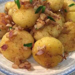 等小土豆完全凉后,用刀拍扁后剥皮,凉的小土豆很好剥皮的