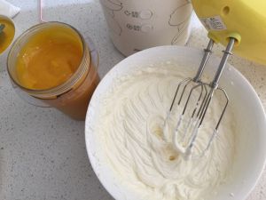 芒果取果肉打成泥,淡奶油打到湿性发泡。