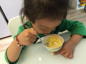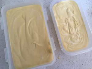 蛋奶糊和果泥加进打发好的奶油里,搅拌均匀,倒进保鲜盒入冷冻室。