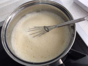 蛋黄,牛奶,糖粉(砂糖也可以)混合,打到发白。小火坐锅,一边加热一边搅拌,防止蛋奶分离,到浓稠状,关火迅速坐进冷水盆降温,然后放入冷藏室备用。