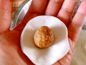 制作馅料:将熟芝麻和熟花生豆放到料理机打碎 ,打碎的花生芝麻粉加入白糖,大油搅拌均匀放入冰箱冷藏三十分钟左右,待馅料基本冻结在一起后拿出切成小块,稍微团一下,让它圆滑一些备用