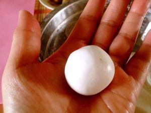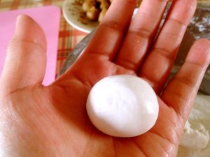 取10克左右的糯米粉化成粉糊,烧开大约100毫升水,将粉糊倒入,熬开成熟米糊,凉到不烫手后倒入糯米粉内,不要一下倒入,边搅拌边倒,搅拌到没有生粉即可。如果米糊不够可适量加水。将搅拌好的糯米粉揉成一团 怕沾手,手上可少沾点油。取一小块,