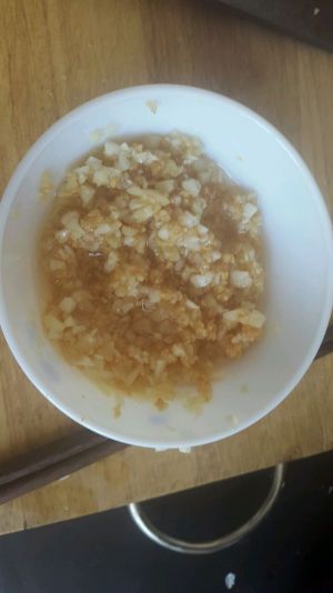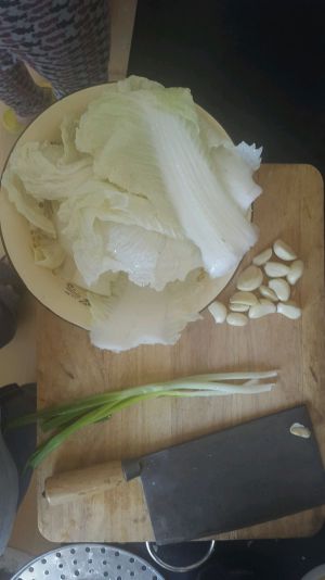 准备配料,粉丝用凉水泡软,娃娃菜洗净(家里没有了,用白菜心代替的),大蒜去皮(图中是一部分,实际用量是这个的两倍),香葱去皮。