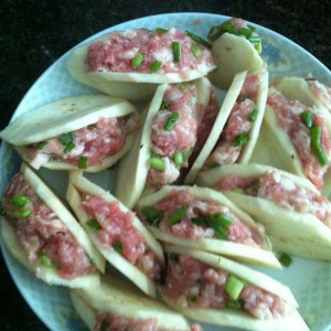把茄子削皮切片(要厚点)中间留一点不要切断,然后就可以将肉放到两片茄子中间压实就行了