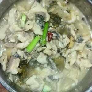 酸菜、鱼骨先下锅炖煮,成出,放到大容器里,原汤再下鱼肉,不要搅动,鱼肉变白即可出锅。浇上热花椒油,撒上香葱,完成!