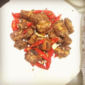 热锅热油,将辣椒姜片大蒜放入锅内爆香,然后放入之前炒好的排骨一起鞭炒,放入蚝油、盐、生抽和孜然粉,最后起锅盛出。