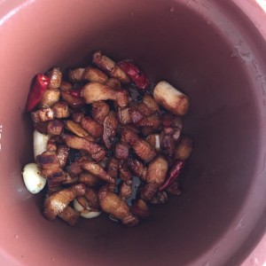 把准备好的花椒等一起倒入锅中炒出香味