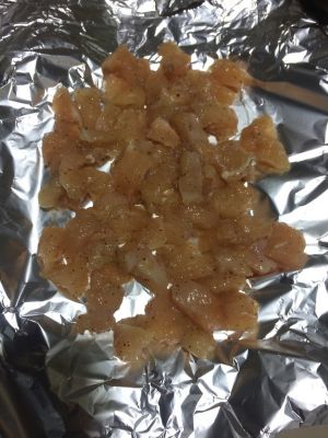 鸡胸切成小丁,用盐、黑胡椒粉、料酒腌制20分钟,然后用锡纸包好入烤箱,上下火250度烤20分钟后拿出晾凉备用。
