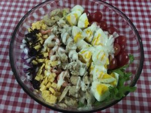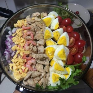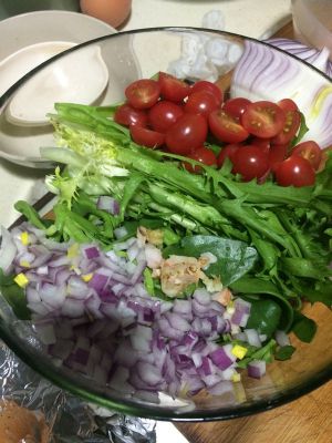 苦苣切两刀平铺在最下面,生菜撕碎也垫在下面,圣女果从中间切开,洋葱切成小丁,鸡蛋煮熟后切十字。芝士片切成小碎丁。