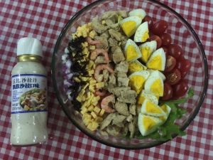 撒上黑胡椒碎,吃的时候淋上沙拉酱汁。