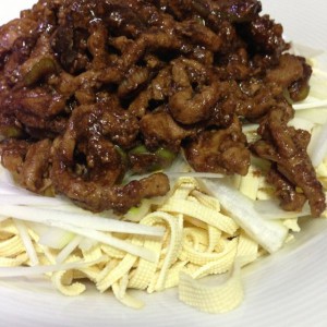肉切丝加料酒,黑胡椒,淀粉抓匀,锅中倒油加入肉丝划炒,微微变色加入葱花炒香,肉变色后倒入面酱