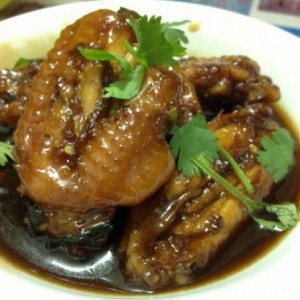 焖到汁都很浓稠的时候就可以了。这个时间,其实要看情况的。装盘,把留下的香菜洒一点在鸡翅上就可以啦