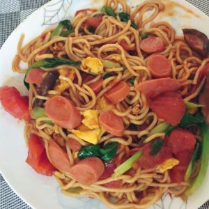 面条煮熟过下凉水,加入生抽 老抽 蚝油 盐 糖 食用油拌匀……
