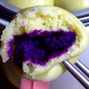 醒好分成一个个小面团,压成饺子皮,放入紫薯馅,包起来揉成小团团,放入电饭煲蒸二三十分钟。