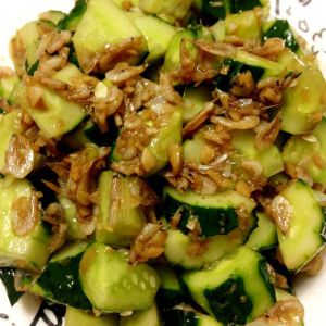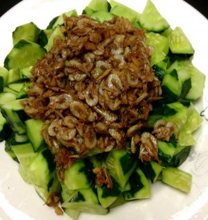 虾皮拌黄瓜炒制的蒜香小虾皮(葱蒜碎末炒香加虾皮,料酒,酱油,醋,糖,鸡精,盐,香油,稍微凉点拌黄瓜