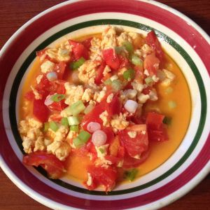 五、将西红柿倒进锅里炒出汁来,然后把鸡蛋倒进去,放盐翻炒,盛出来撒上葱花。