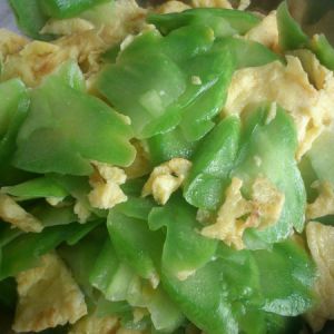 用盐水泡制的苦瓜片捞起冲洗一遍沥干,锅里热油七分热苦瓜倒入干炒六分熟放盐糖(盐跟糖的比例是8;2)接着蛋皮倒入一起炒,炒出味道即可出锅