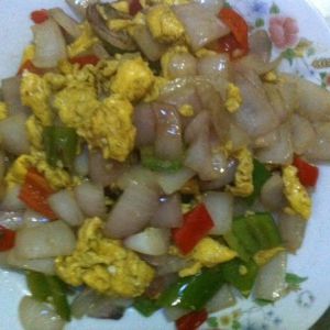 锅底倒油,油热下洋葱和青红椒,加盐翻炒