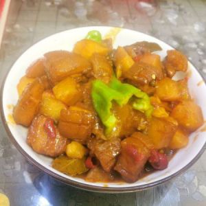 放入料酒,生姜大蒜花椒翻炒加入豆瓣酱,放老抽给五花肉上色,放入配菜卤料一起翻炒,加入烧卤汁,盐,干辣椒一起翻炒入味加入水烧开小火慢闷至汤干为止。水可以多加点,土豆肉皮不易熟。
