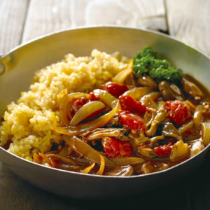 油锅预热,倒入蒜末,炒香后加入洋葱,然后放入香菇和人工菌翻炒,炒熟后倒入小麦粉