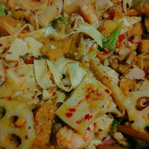 西蓝花,香菇切块!豆腐皮,油豆腐皮,面筋,千页豆腐切条备用