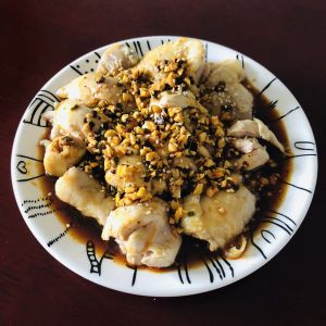 提前剁好的蒜末,加上花椒适量,放入油里炸,再加上打结的葱。炸至葱变黑色后过滤捞出蒜末等,留下香油备用