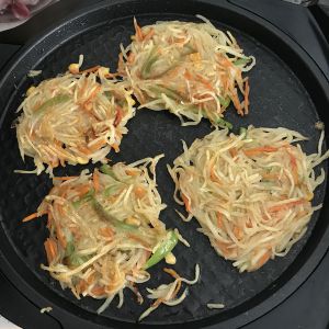 在电饼铛上放上一层油,等电饼铛预热后就可以放进去,煎成饼的形状,尽量压薄一点。等两面都煎的金黄就可以装盘了!是不是很简单~