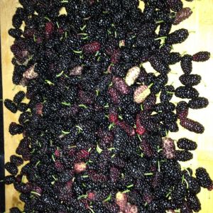 刚摘回来的新鲜熟透的桑葚,清水冲洗后放在案板上控水