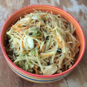 先锅里放进油、放入花椒和辣椒圈爆锅、在放入尖椒丝炒一会,在放入土豆丝和胡萝卜丝爆炒一下、放醋、味极鲜、花椒面、姜粉、味精、盐、大火爆炒、