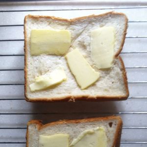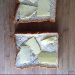 取厚吐司,在表面用刀划出菱形纹,便于黄油渗透进去,在划好的面包上放上黄油片