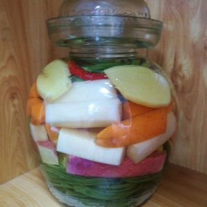 坛子控干水后,先加的泡菜盐,也就是大颗粒盐。
