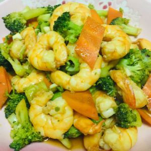 锅里加少许底油,加葱姜蒜爆香,然后把焯好的西蓝花和胡萝卜加入,加少许盐,鸡精和海鲜酱油,翻炒均匀。