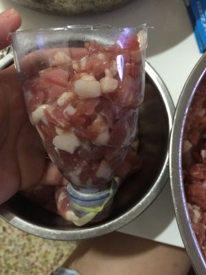我准备一个口比较宽的矿泉水空瓶,减去底部,反过来就是漏斗了,肠衣用清水反复漂洗多次后泡水里半天,使用之前再用白酒清洗一次,再漂洗一遍挤干水就可以用了。玉米皮把它们撕成小条用来做绳子。把肠衣套在瓶口后用玉米皮绑好,现在可以开始灌肠了