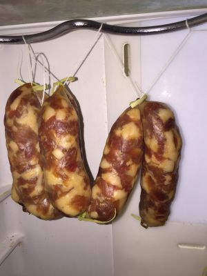 这次做的腊肠,在把所有材料混合后放置一小时,再次拌匀取500克腊肉加入黑胡椒粉3克和白胡椒粉4克混合均匀后,都放入冰箱冷藏一天。隔夜就可以灌肠,风干,灌肠风干一夜后,蒸了一条试试效果,没想到更香,儿子很喜欢。