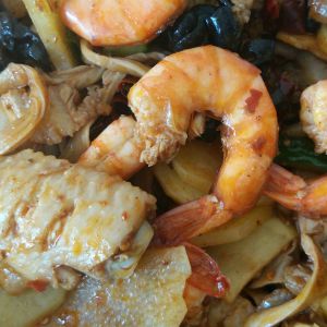 煎熟后放入麻辣香锅调料和姜葱蒜、大虾翻炒
