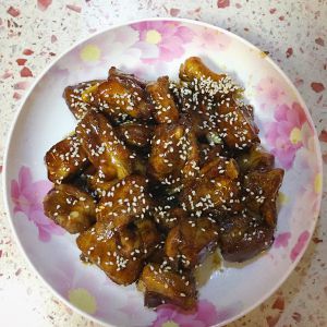 炸排骨的锅将油滤出,然后直接加入腌制排骨时的汤汁儿,再加3羹匙糖,1羹匙醋,1勺盐和三分之一小碗水。小火炖12分钟左右,然后大火收汁,出锅前加入1羹匙醋,翻炒均匀。