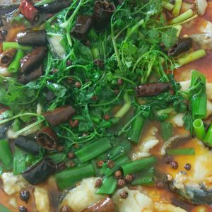 鱼片放入一分钟起锅。上面撒上葱段和香菜