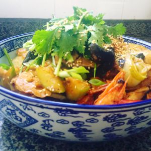 下蔬菜喽~(我发现锅太小菜太多撑不下....此处换了一个大锅o(╯□╰)o).倒入一勺麻辣香锅调料翻炒三至五分钟.加两勺生抽.半勺糖(这个非常非常重要.画龙点睛.)一勺醋.尝一下根据喜爱程度加盐.翻炒均匀出锅~(这里本来应该在出锅前一分钟加入切好的西芹和彩椒调色.我因为换了个锅完全忘记了.好在不影响口感)