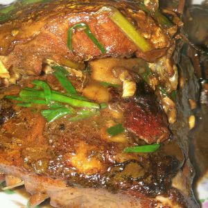 锅中放油烧开,小火,把鱼放进去煎,煎至金黄色后翻另一边煎,加入开水,开始用小火煮十分钟左右,然后放葱,大火收汁「当然鱼快煮熟的情况下了