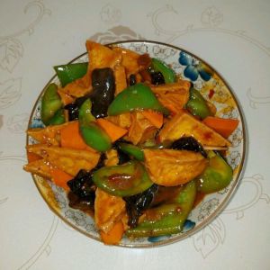 豆腐切三角,萝卜青椒切片,木耳切小块就ok