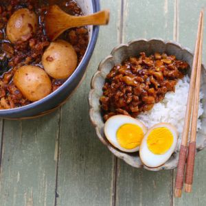 盛上一碗执乎乎的白米饭,浇上一大勺香气四溢的卤肉,卤蛋切成两片,再添点蔬菜,即成一碗好吃的台湾卤肉饭。