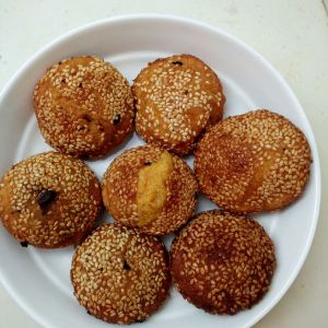 放入红豆沙后揉圆,轻轻压平一边,喜欢芝麻的话可以裹上白芝麻